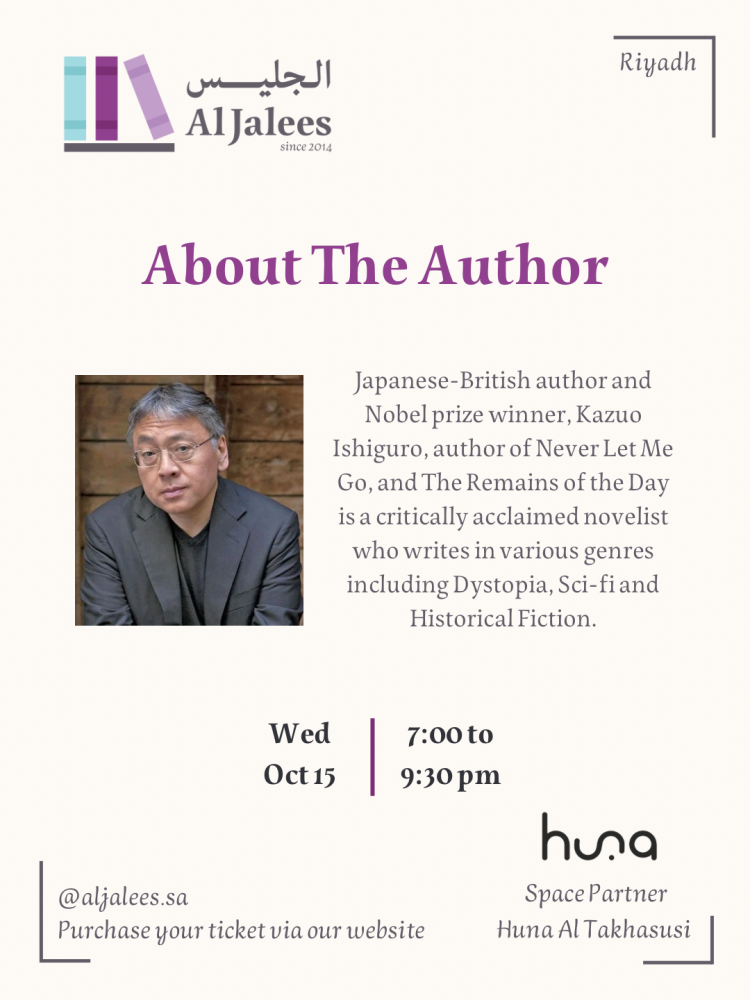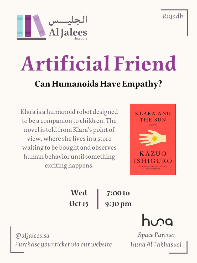 Join Al Jalees for an engaging literary evening as we dive into Klara and the Sun by Nobel Prize-winning author Kazuo Ishiguro.